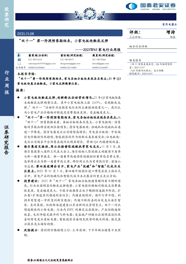 【国泰君安证券】【20211108】2021W45家电行业周报:“双十一”第一阶段预售期结束,小家电板块触底反弹-13页