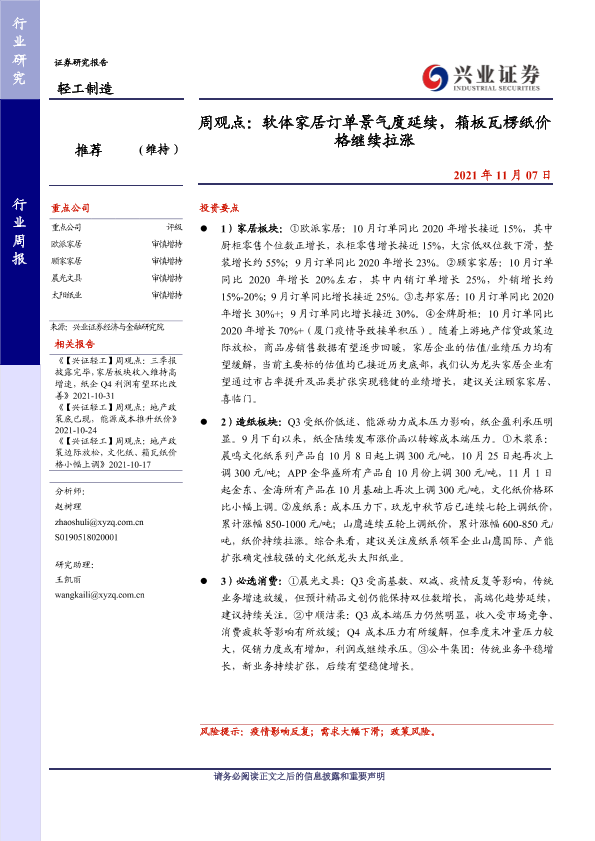 家居订单 箱板瓦楞纸 纸价上涨 证券研究 轻工制造