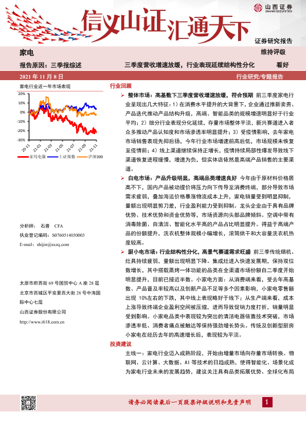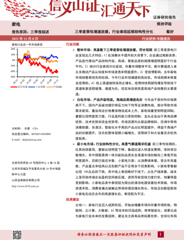【山西证券】【20211108】家电行业:三季度营收增速放缓,行业表现延续结构性分化-24页