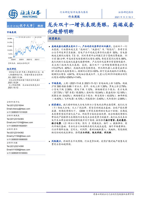 【海通证券】【20211115】家用电器与器具行业周报:龙头双十一增长表现亮眼,高端成套化趋势明晰-5页