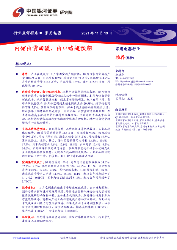 【银河证券】【20211119】家用电器行业点评报告:内销出货回暖、出口略超预期-7页