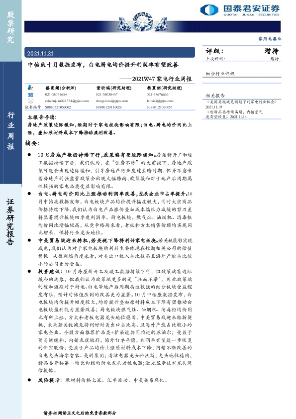 【国泰君安证券】【20211121】2021W47家电行业周报:中怡康十月数据发布,白电厨电均价提升利润率有望改善-12页