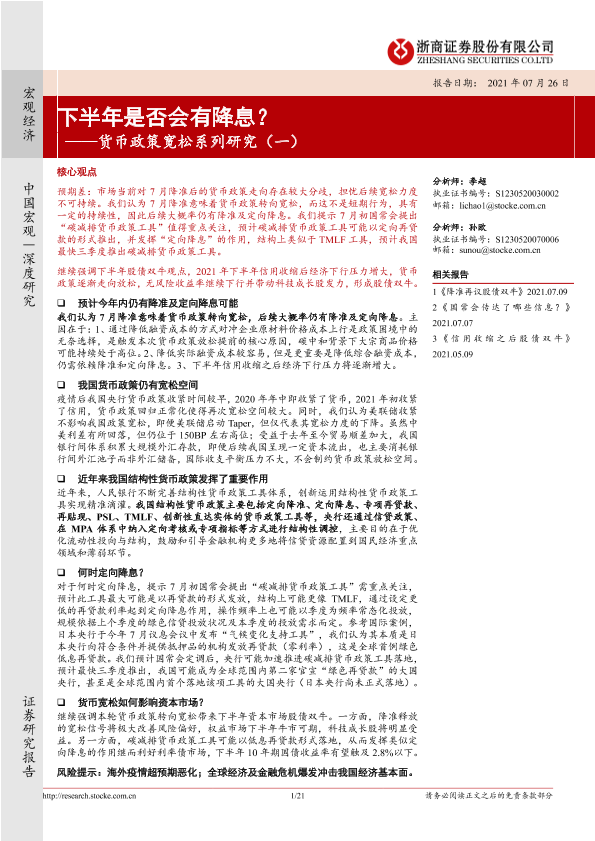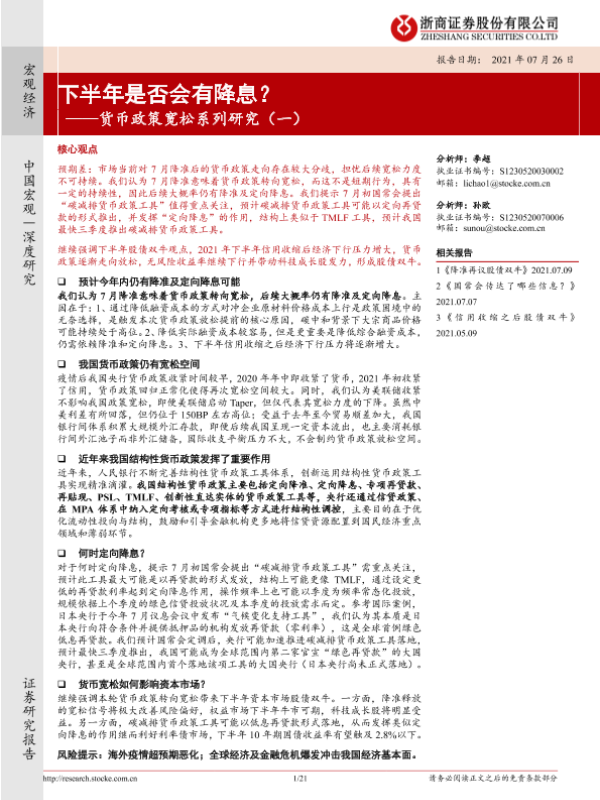 【浙商证券】【20210726】货币政策宽松系列研究(一):下半年是否会有降息?-21页