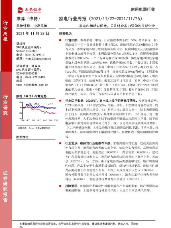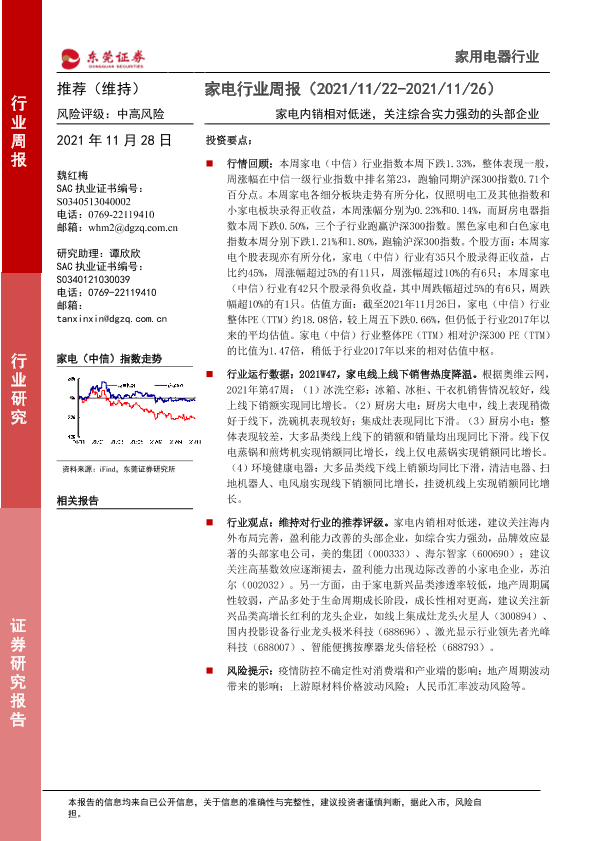 【东莞证券】【20211128】家电行业周报:家电内销相对低迷,关注综合实力强劲的头部企业-14页