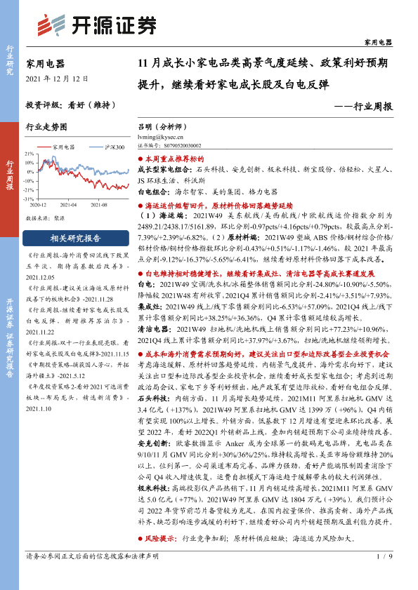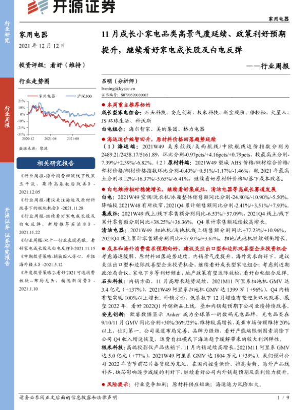【开源证券】【20211212】20211212-开源证券-家用电器行业周报:11月成长小家电品类高景气度延续、政策利好预期提升,继续看好家电成长股及白电反弹-9页