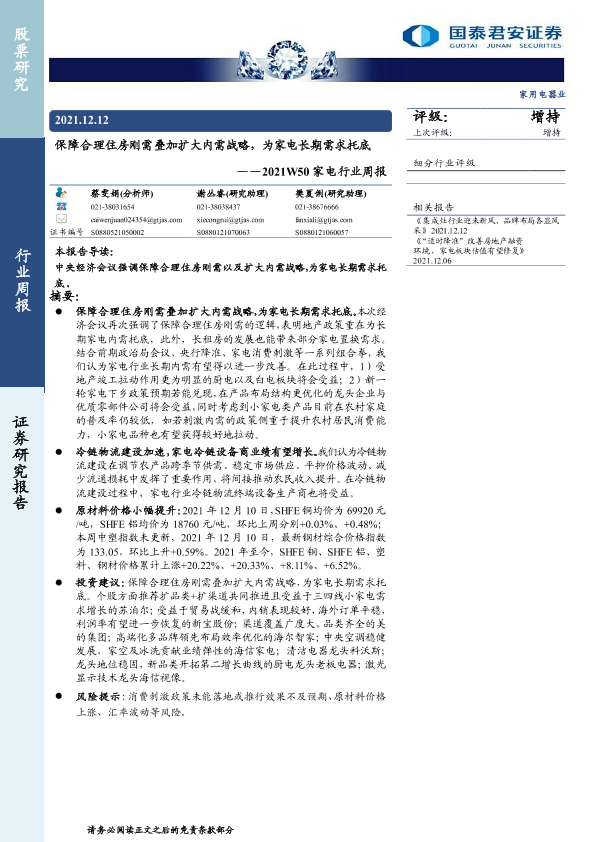 【国泰君安证券】【20211212】2021W50家电行业周报:保障合理住房刚需叠加扩大内需战略,为家电长期需求托底-10页