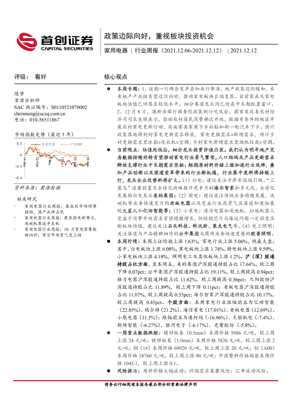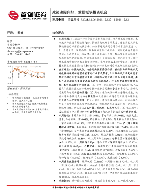 【首创证券】【20211212】家用电器行业周报:政策边际向好,重视板块投资机会-16页