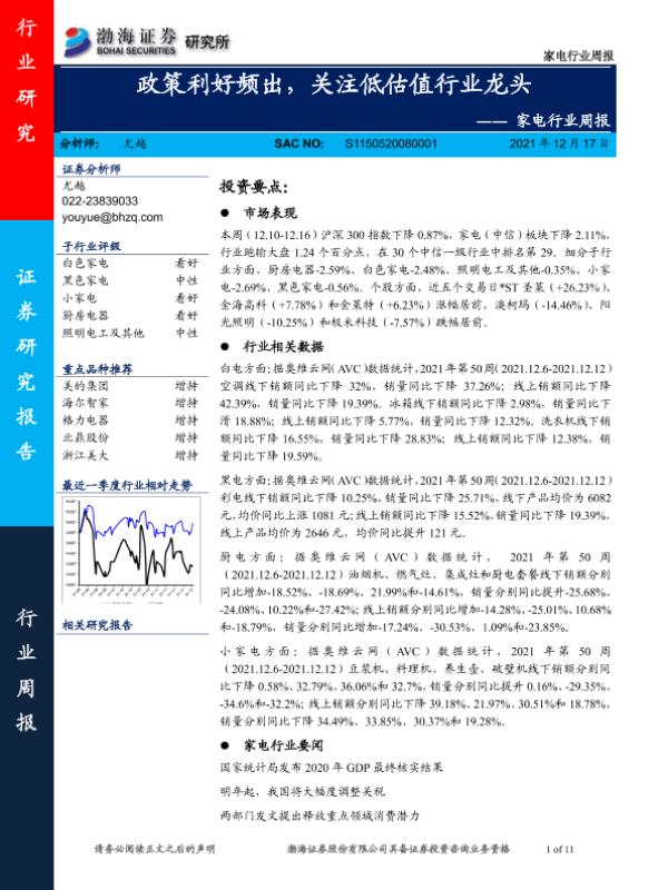 【渤海证券】【20211217】家电行业周报:政策利好频出,关注低估值行业龙头-11页