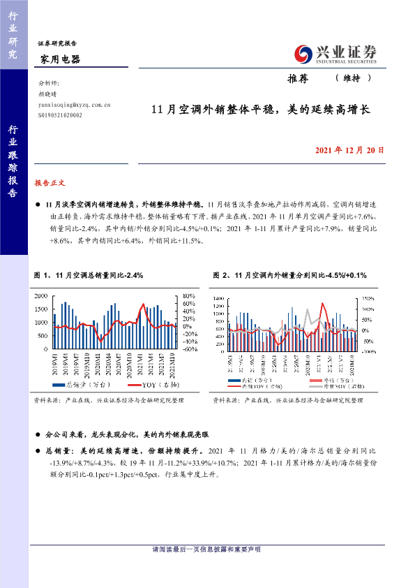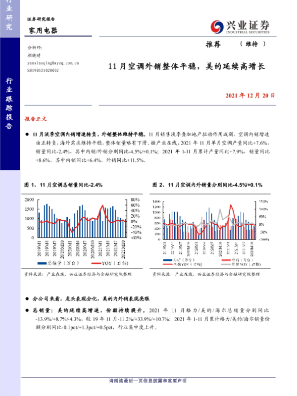 【兴业证券】【20211220】11月空调外销整体平稳,美的延续高增长-4页