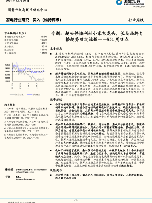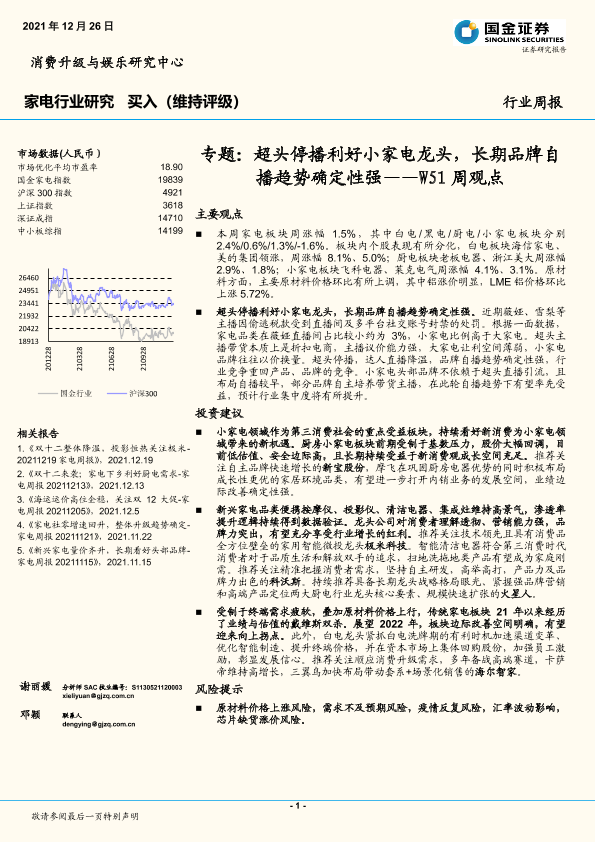 【国金证券】【20211226】20211226-国金证券-家电行业W51周观点:专题:超头停播利好小家电龙头,长期品牌自播趋势确定性强-16页