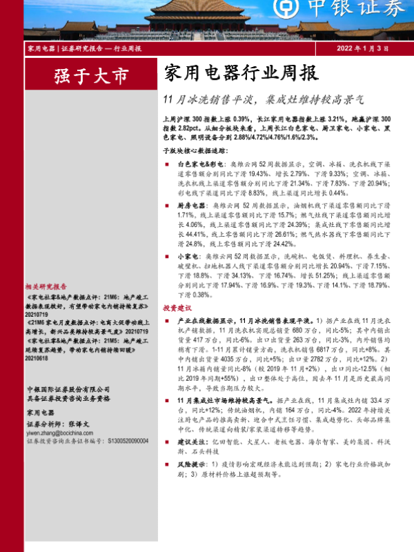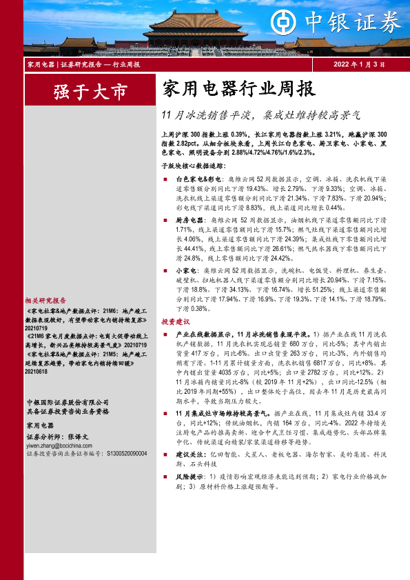 【中银证券】【20220103】20220103-中银证券-家用电器行业周报:11月冰洗销售平淡,集成灶维持较高景气-31页