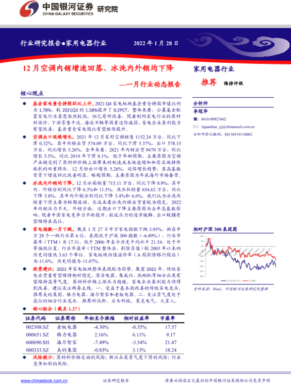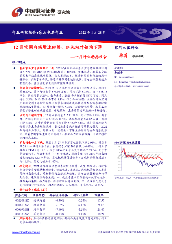 【银河证券】【20220128】家用电器行业一月行业动态报告:12月空调内销增速回落、冰洗内外销均下降-25页