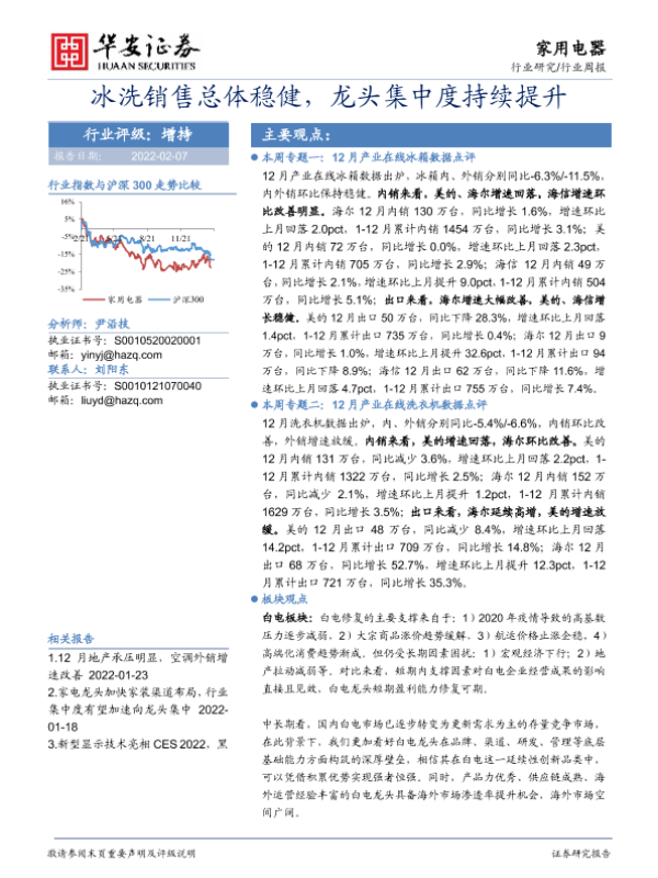【华安证券】【20220207】家用电器行业周报:冰洗销售总体稳健,龙头集中度持续提升-20页