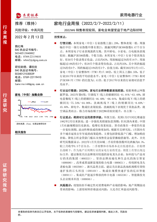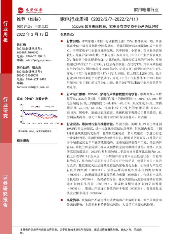 【东莞证券】【20220213】20220213-东莞证券-家电行业周报:2022W6销售表现较弱,家电业有望受益于地产边际好转-12页
