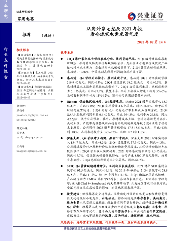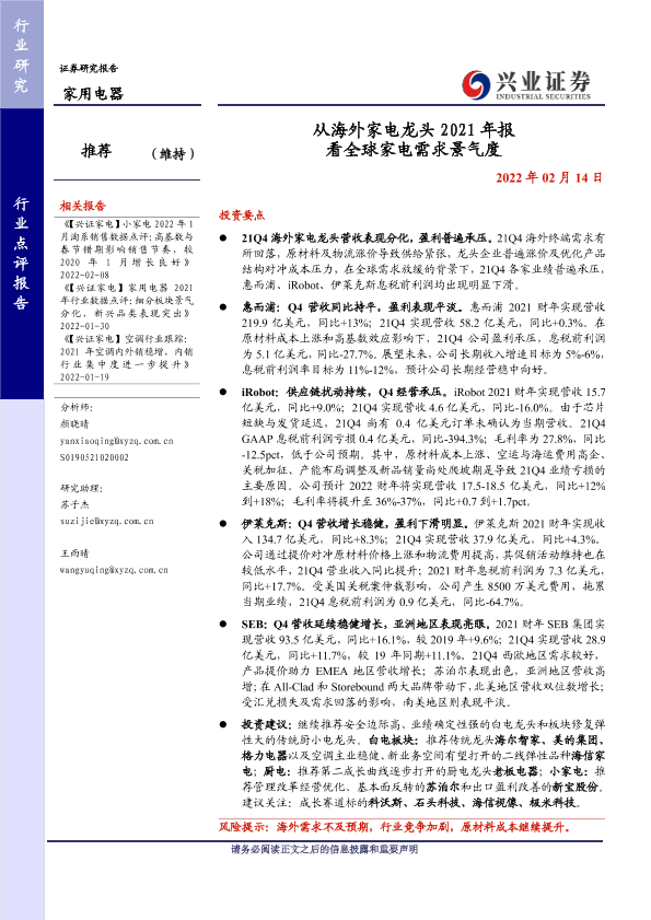 【兴业证券】【20220214】从海外家电龙头 2021年报 看全球家电需求景气度-18页