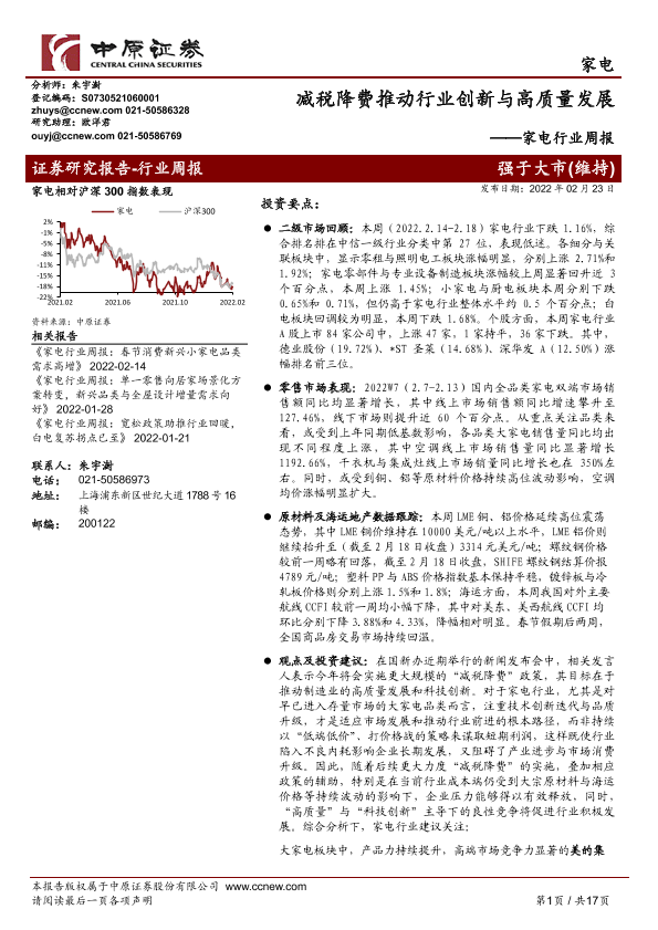 【中原证券】【20220223】家电行业周报:减税降费推动行业创新与高质量发展-17页
