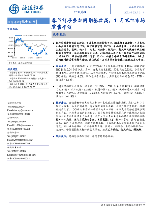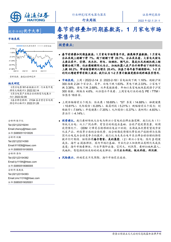 【海通证券】【20220221】家用电器与器具行业周报:春节前移叠加同期基数高,1月家电市场零售平淡-4页