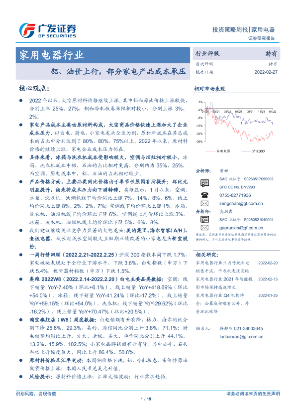 【广发证券】【20220227】家用电器行业投资策略周报:铝、油价上行,部分家电产品成本承压-19页