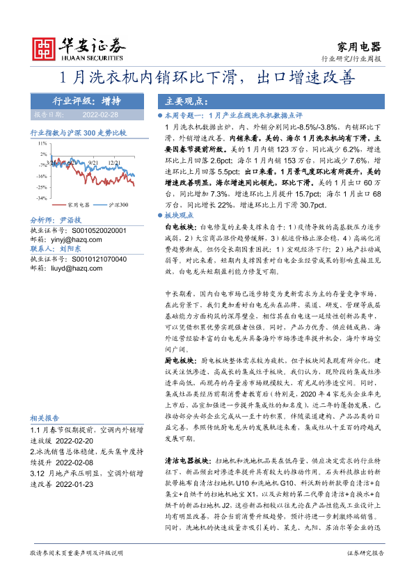 【华安证券】【20220228】20220228-华安证券-家用电器行业周报:1月洗衣机内销环比下滑,出口增速改善-14页