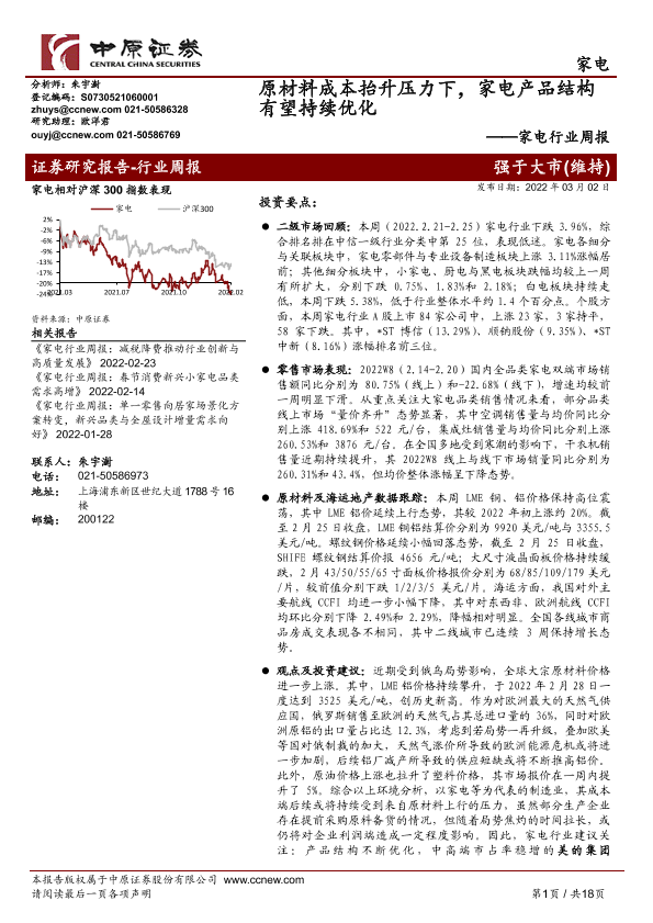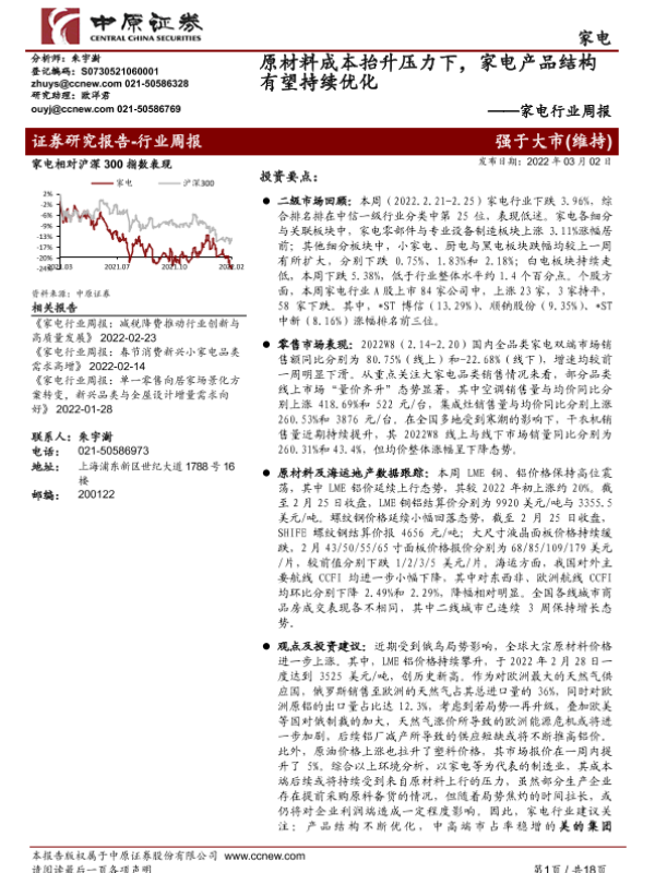 【中原证券】【20220302】家电行业周报:原材料成本抬升压力下,家电产品结构有望持续优化-18页