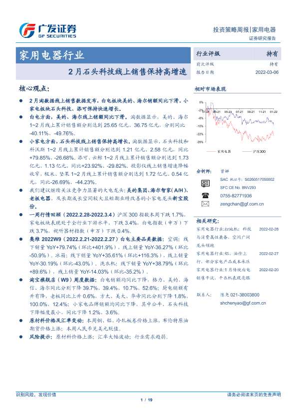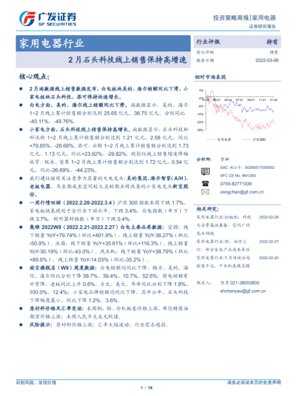 【广发证券】【20220306】20220306-广发证券-家用电器行业投资策略周报:2月石头科技线上销售保持高增速-19页