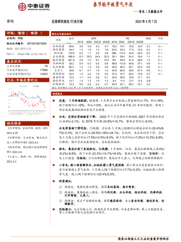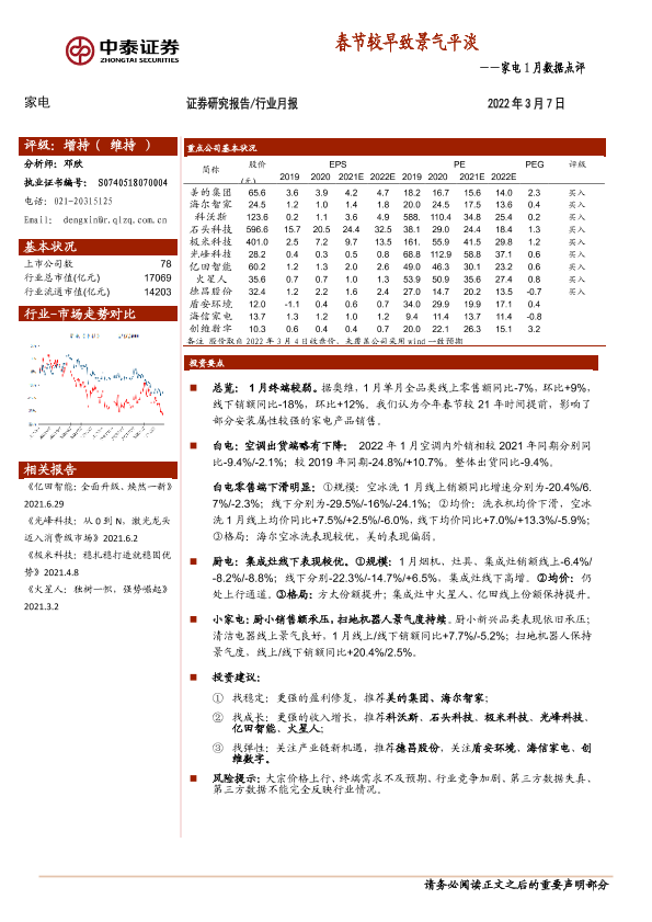 【中泰证券】【20220307】家电1月数据点评:春节较早致景气平淡-16页