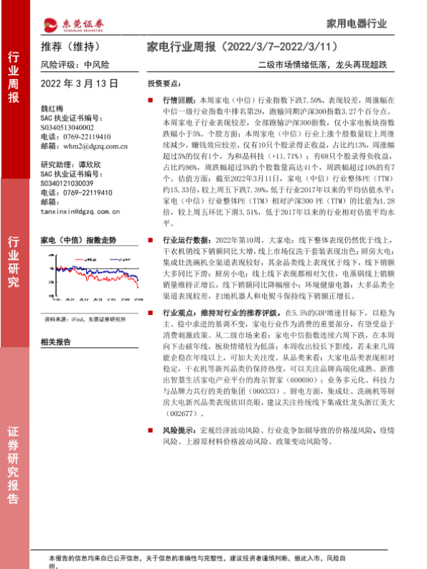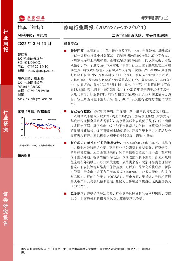【东莞证券】【20220313】20220313-东莞证券-家电行业周报:二级市场情绪低落,龙头再现超跌-16页