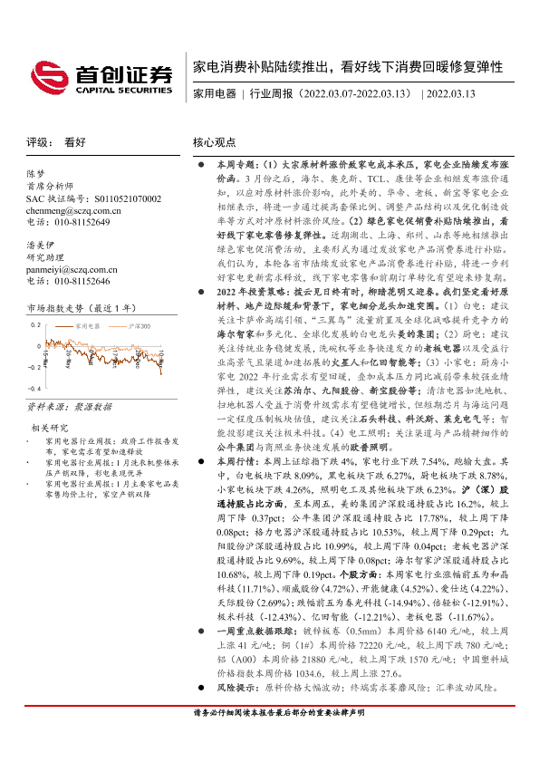 【首创证券】【20220313】20220313-首创证券-家用电器行业周报:家电消费补贴陆续推出,看好线下消费回暖修复弹性-18页
