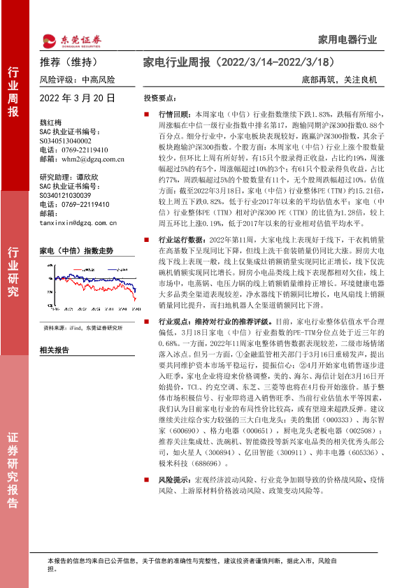【东莞证券】【20220320】家电行业周报:底部再筑,关注良机-16页