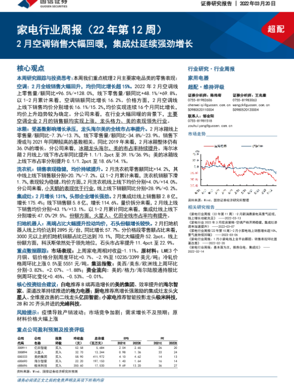 【国信证券】【20220320】家电行业周报(22年第12周):2月空调销售大幅回暖,集成灶延续强劲增长-17页