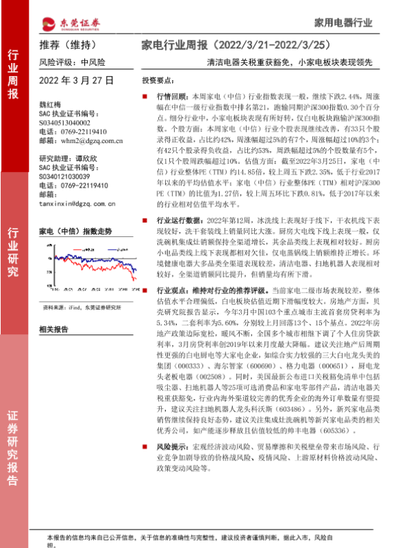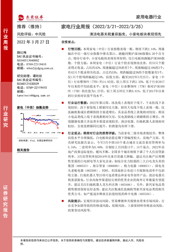 【东莞证券】【20220327】家电行业周报:清洁电器关税重获豁免,小家电板块表现领先-15页