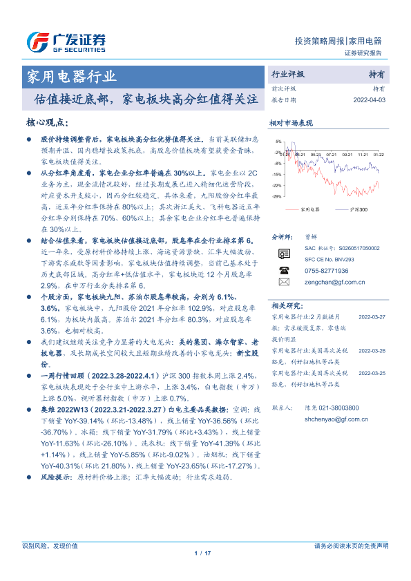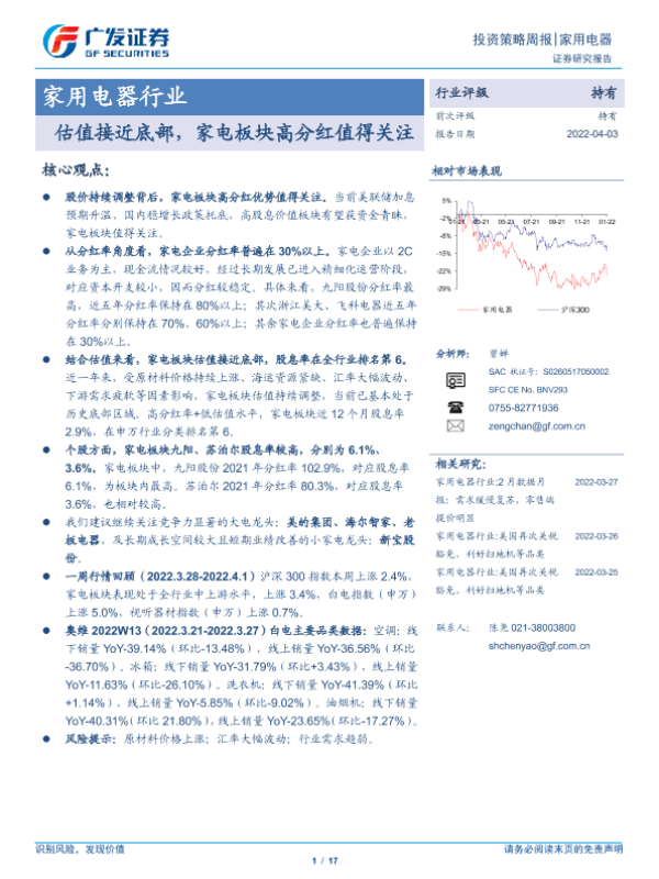 【广发证券】【20220403】20220403-广发证券-家用电器行业投资策略周报:估值接近底部,家电板块高分红值得关注-17页