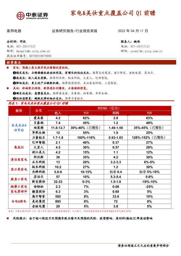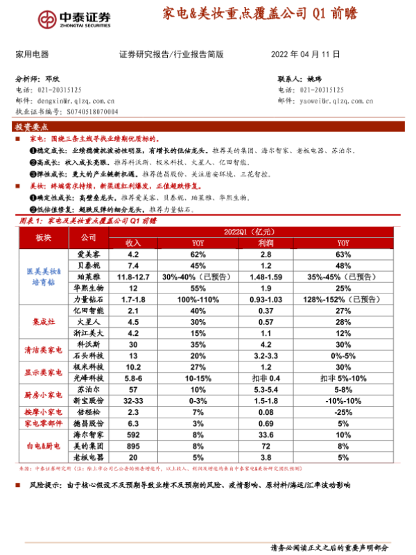 【中泰证券】【20220411】家电&美妆重点覆盖公司Q1前瞻-2页