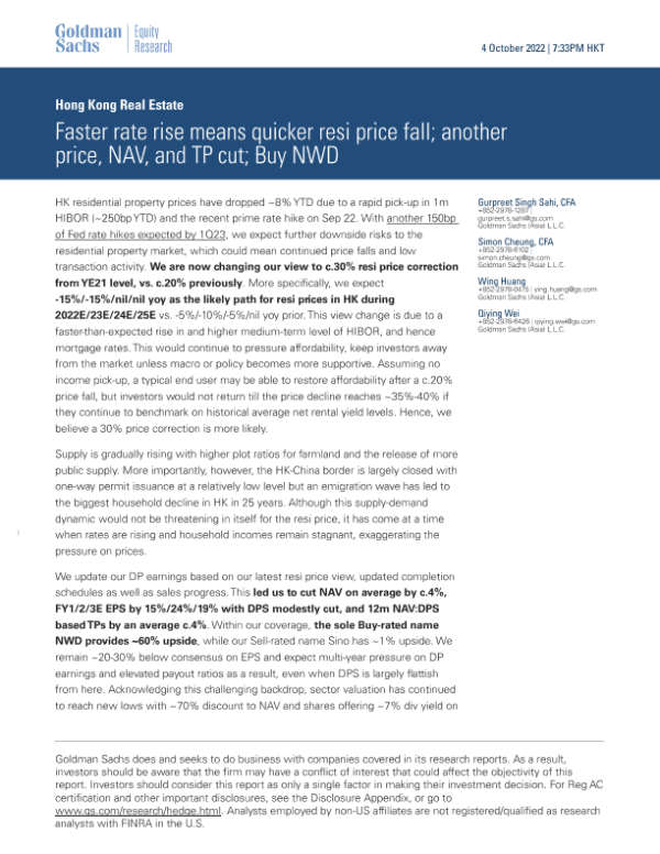 【Goldman Sachs】【20221004】更快的利率上升意味着更快的住宅价格下跌;再次下调价格、NAV和TP;买入NWD-19页
