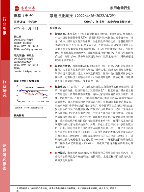 【东莞证券】【20220501】家电行业周报:稳地产、促消费,家电内销有望回暖-16页