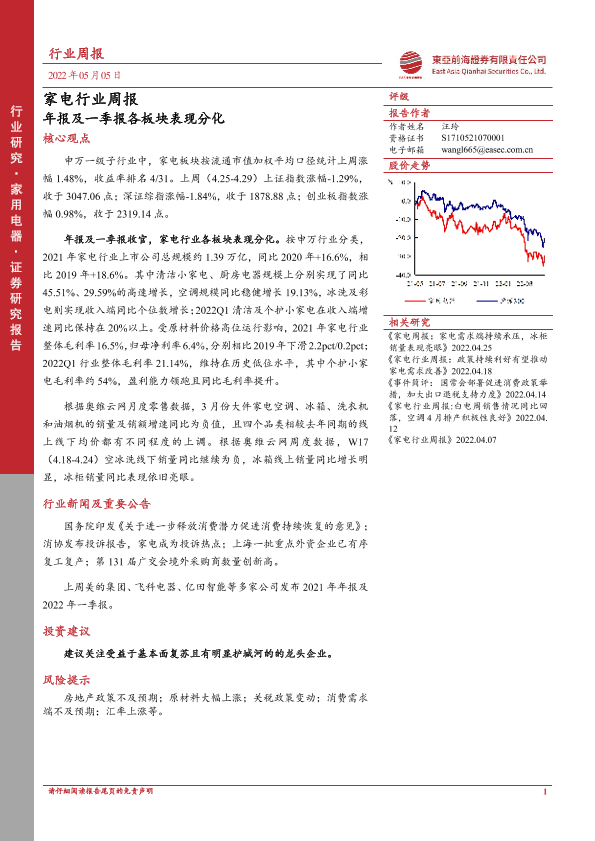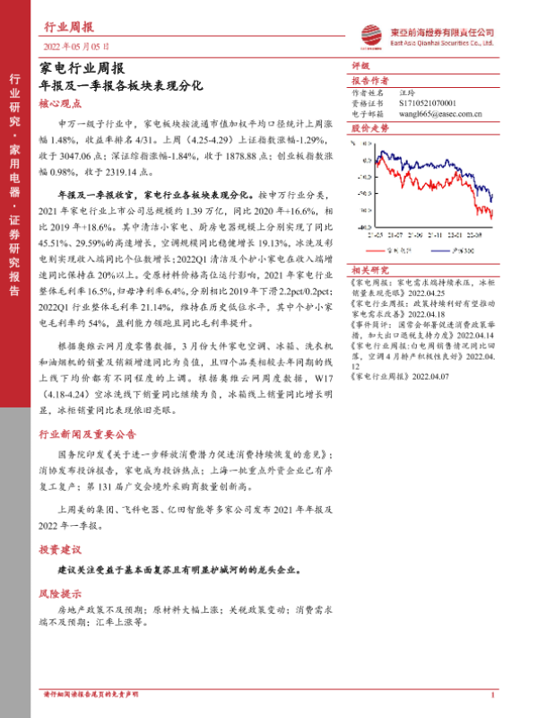 【东亚前海证券】【20220505】家电行业周报:年报及一季报各板块表现分化-20页