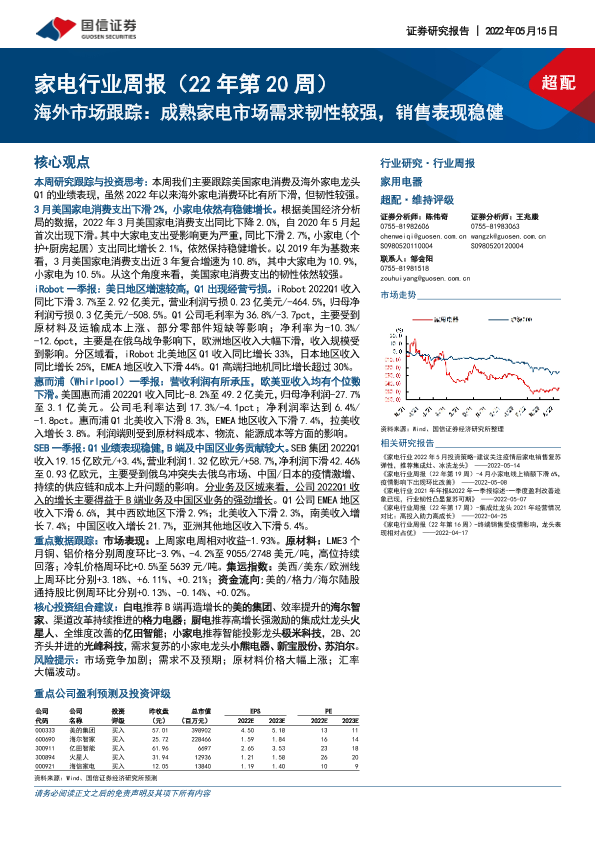 【国信证券】【20220515】家电行业周报(22年第20周):海外市场跟踪:成熟家电市场需求韧性较强,销售表现稳健-15页