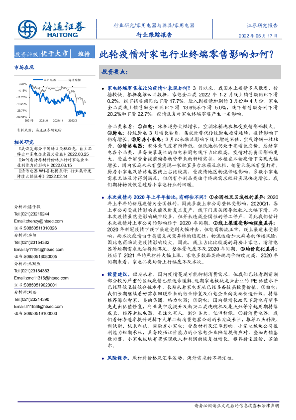 【海通证券】【20220517】20220517-海通证券-家用电器行业跟踪报告:此轮疫情对家电行业终端零售影响如何?-6页