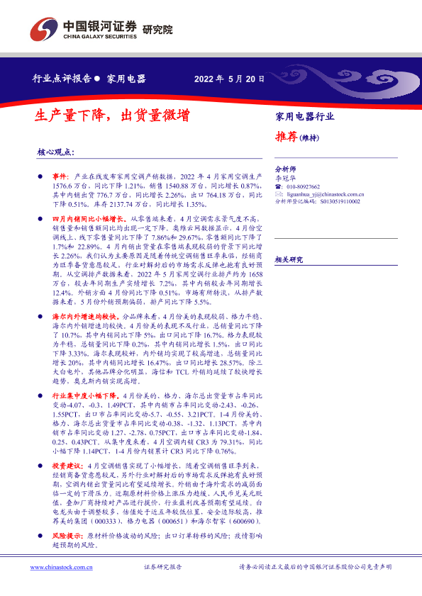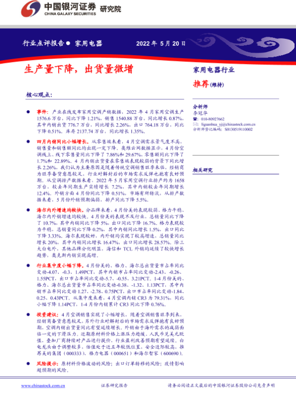 【银河证券】【20220520】家用电器行业点评报告:生产量下降,出货量微增-6页