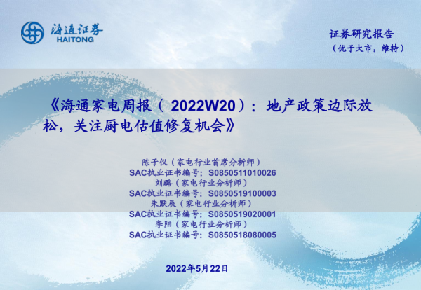 【海通证券】【20220522】海通家电周报(2022W20):地产政策边际放松,关注厨电估值修复机会-15页