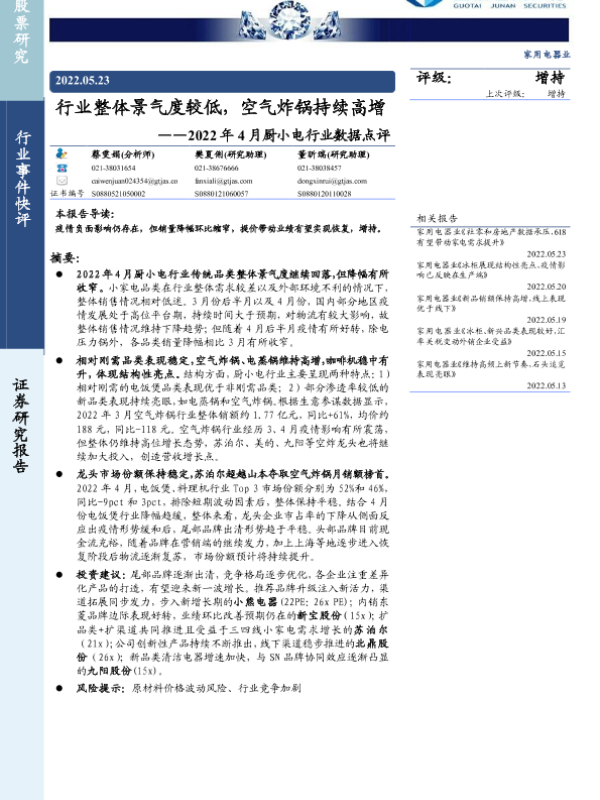 【国泰君安证券】【20220523】2022年4月厨小电行业数据点评:行业整体景气度较低,空气炸锅持续高增-11页
