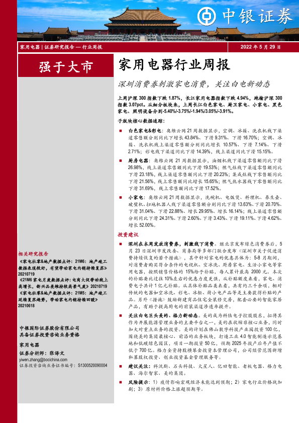 【中银证券】【20220529】20220529-中银证券-家用电器行业周报:深圳消费券刺激家电消费,关注白电新动态-25页