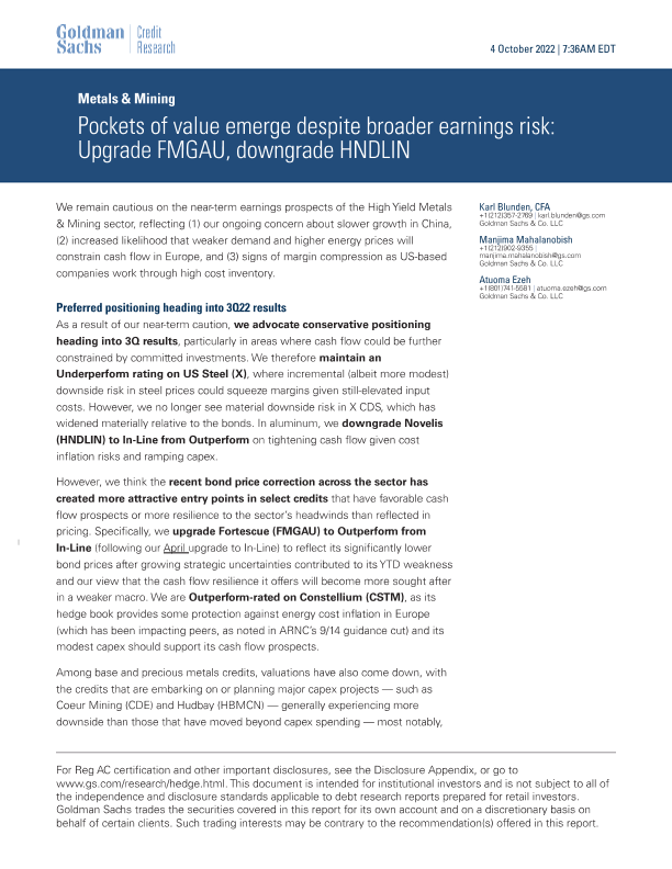 【Goldman Sachs】【20221004】尽管整体盈利风险犹存仍浮现机会:升级FMGAU,降级HNDLIN-20页