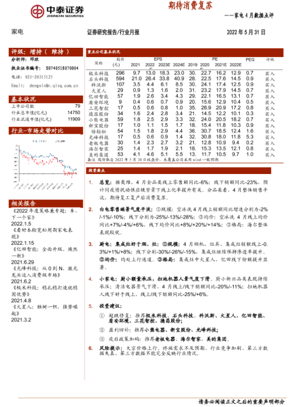 【中泰证券】【20220531】家电4月数据点评:期待消费复苏-15页