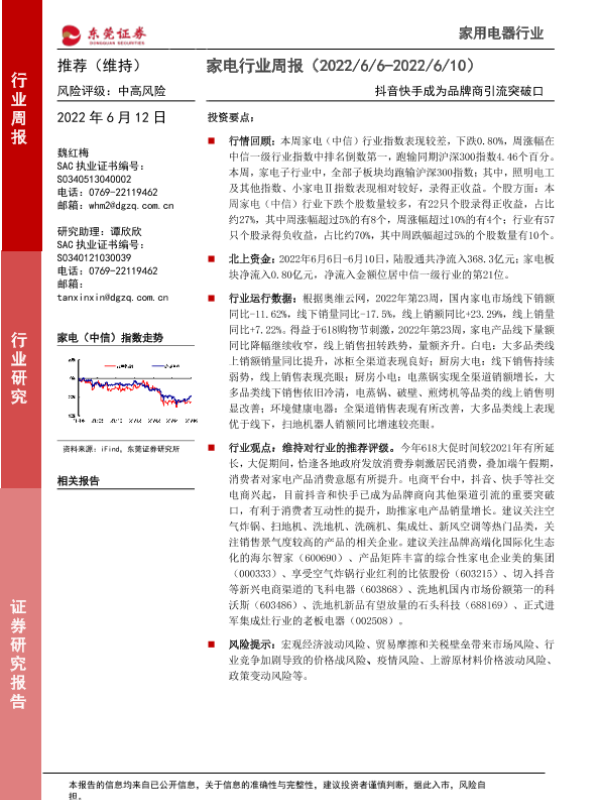【东莞证券】【20220612】20220612-东莞证券-家电行业周报:抖音快手成为品牌商引流突破口-15页