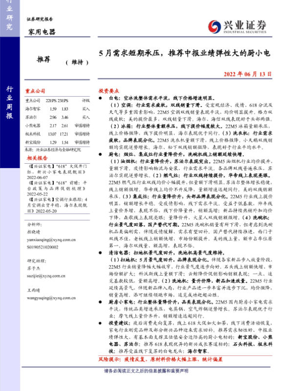 【兴业证券】【20220613】20220613-兴业证券-家用电器行业周报:5月需求短期承压,推荐中报业绩弹性大的厨小电-19页