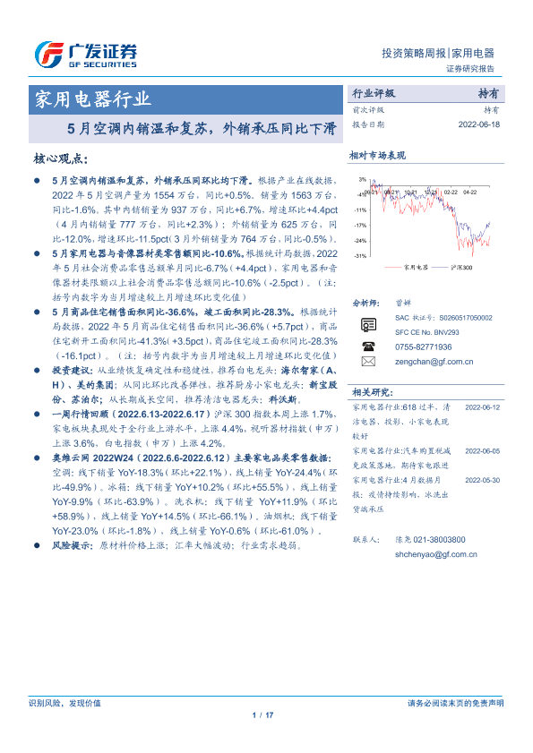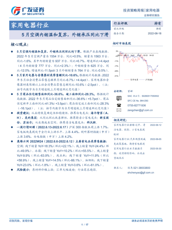 【广发证券】【20220618】20220618-广发证券-家用电器行业投资策略周报:5月空调内销温和复苏,外销承压同比下滑-17页