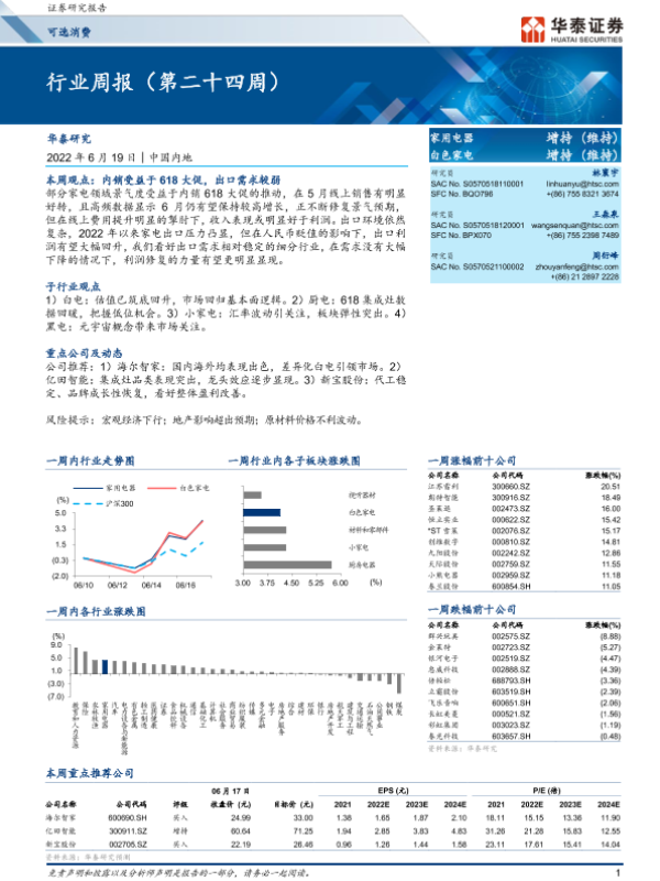 【华泰证券】【20220619】20220619-华泰证券-家用电器行业周报(第二十四周)-18页
