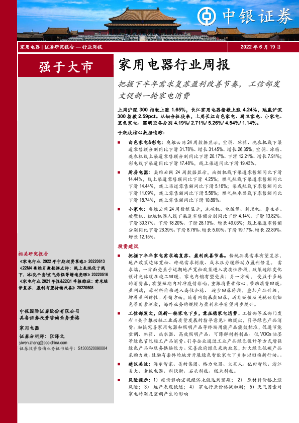 【中银证券】【20220619】20220619-中银证券-家用电器行业周报:把握下半年需求复苏盈利改善节奏,工信部发文促新一轮家电消费-27页