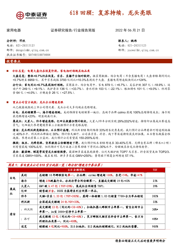【中泰证券】【20220621】20220621-中泰证券-家用电器行业报告简版:618回顾:复苏持续,龙头亮眼-3页